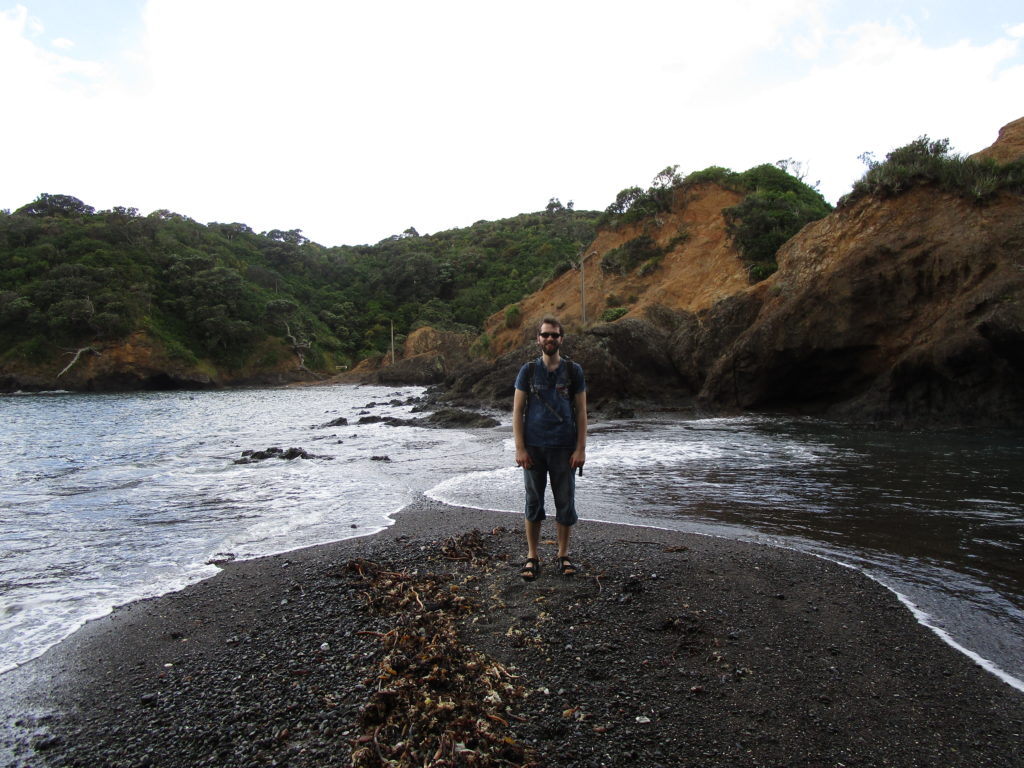 Dutzende Fotos später fahren wir weiter nach Rangiputa, um noch einen Strandspaziergang zu machen. Man fliegt schließlich nicht jede Woche nach Neuseeland. Mit der einsetzenden Flut wird die Wegfindung zur Herausforderung – wir krabbeln und rutschen über steinige Felsen, bis die Hosenbeine klatschnass sind. Schließlich werden wir mit einer herrlichen Aussicht auf die Rangaunu Bay belohnt.