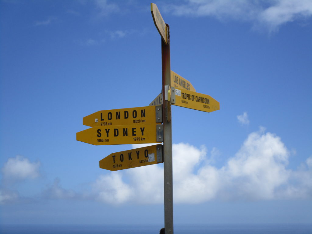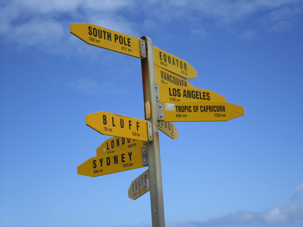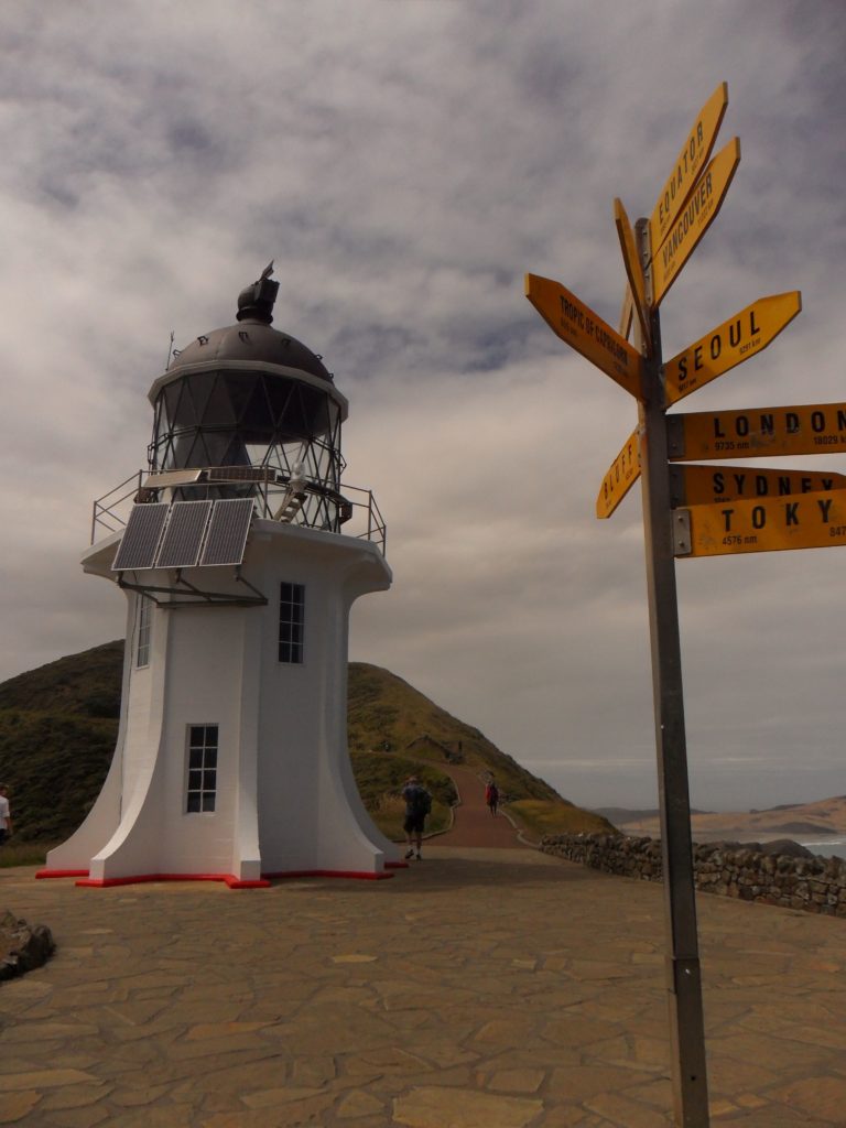 Gegen 10:30 Uhr erreichen wir einen relativ leeren Parkplatz. Bei leichtem Regen laufen wir einige hundert Meter auf dem Te Araroa Trail entlang der schäumenden Küste zu einem kleinen, weißen Leuchtturm mit einer gläsernen, zylinderförmigen Kuppel. Auf der Aussichtsplattform davor stehen zahlreiche gelbe Wegweiser, welche die Entfernungen zu verschiedenen Weltmetropolen verdeutlichen (London ist 18.029 Kilometer entfernt). Die Sonne brennt vom Himmel und es ist ziemlich heiß – zum Glück haben wir was zu trinken dabei.