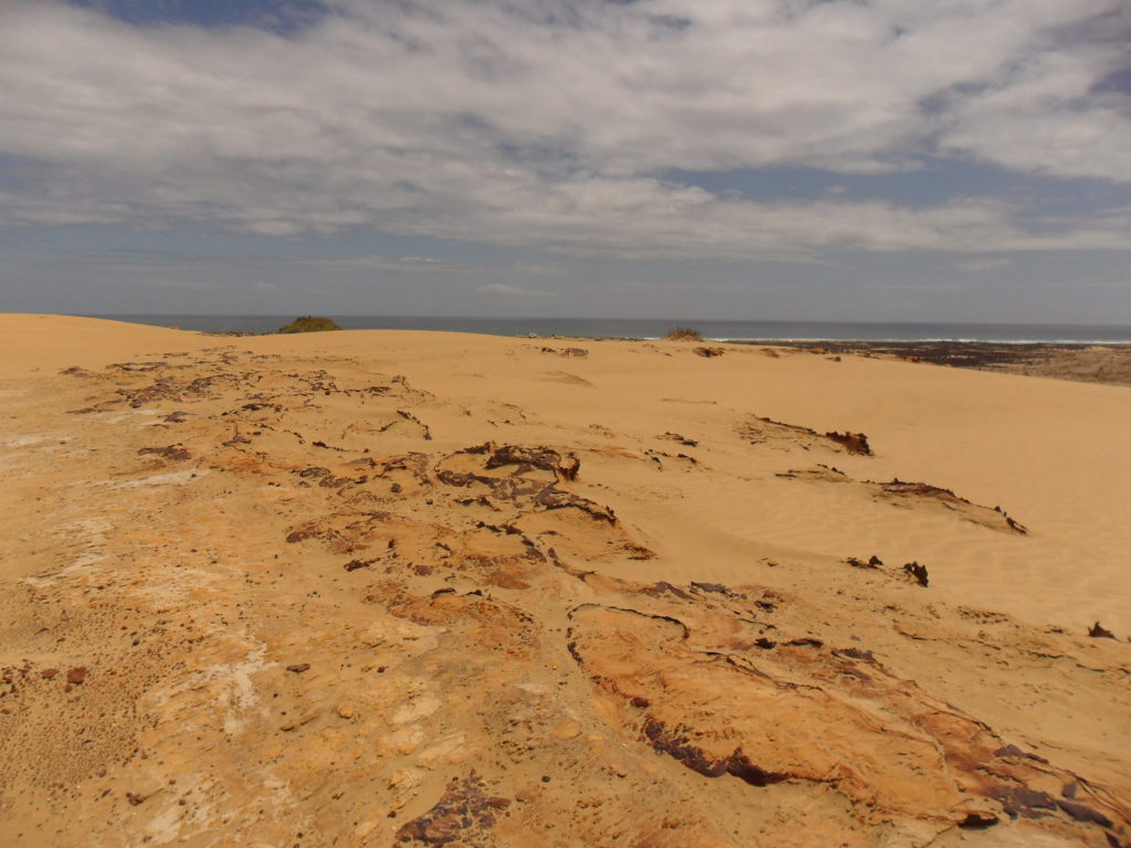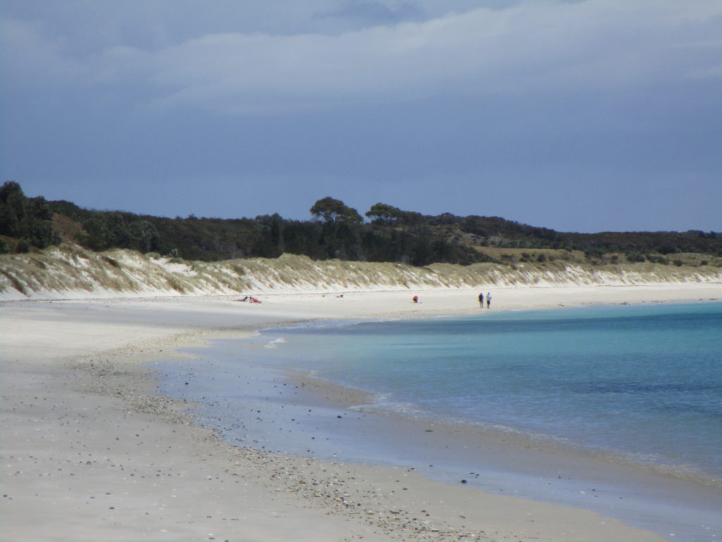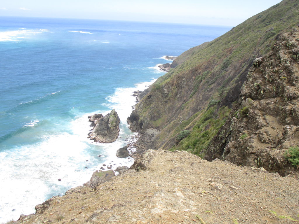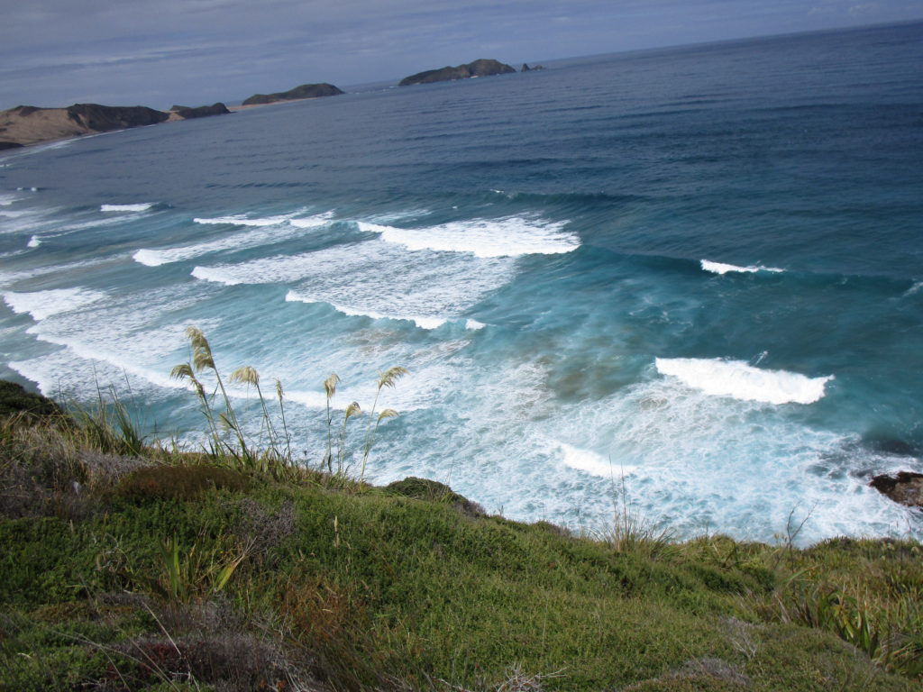 Anschließend laufen wir noch ein gutes Stück in Richtung Strand bergab, in der Hoffnung bis ans Wasser zu gelangen. Die üppige, niedrige Vegetation mit teilweise dornigen Sandgewächsen macht den Weg aber sehr beschwerlich und so treten wir nach einer Weile den Rückweg an, der – Überraschung – aufwärts führt. Der Getränkevorrat geht zur Neige, doch wir knipsen viele tolle Fotos von sich brechenden Wellen, wo die Tasmanische See auf den Pazifik trifft.