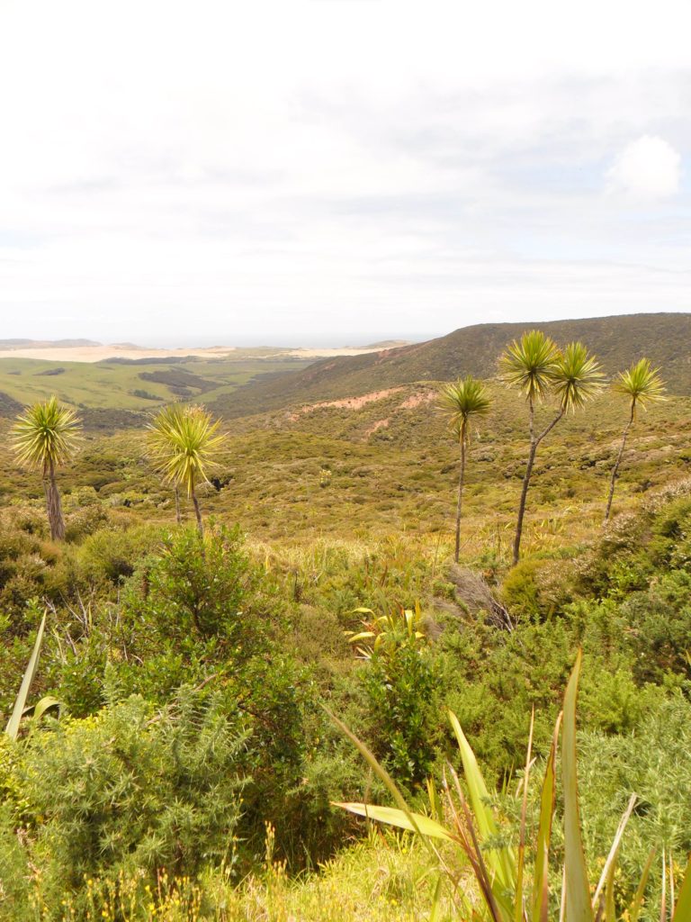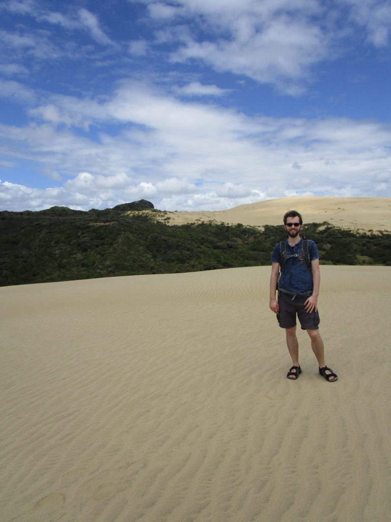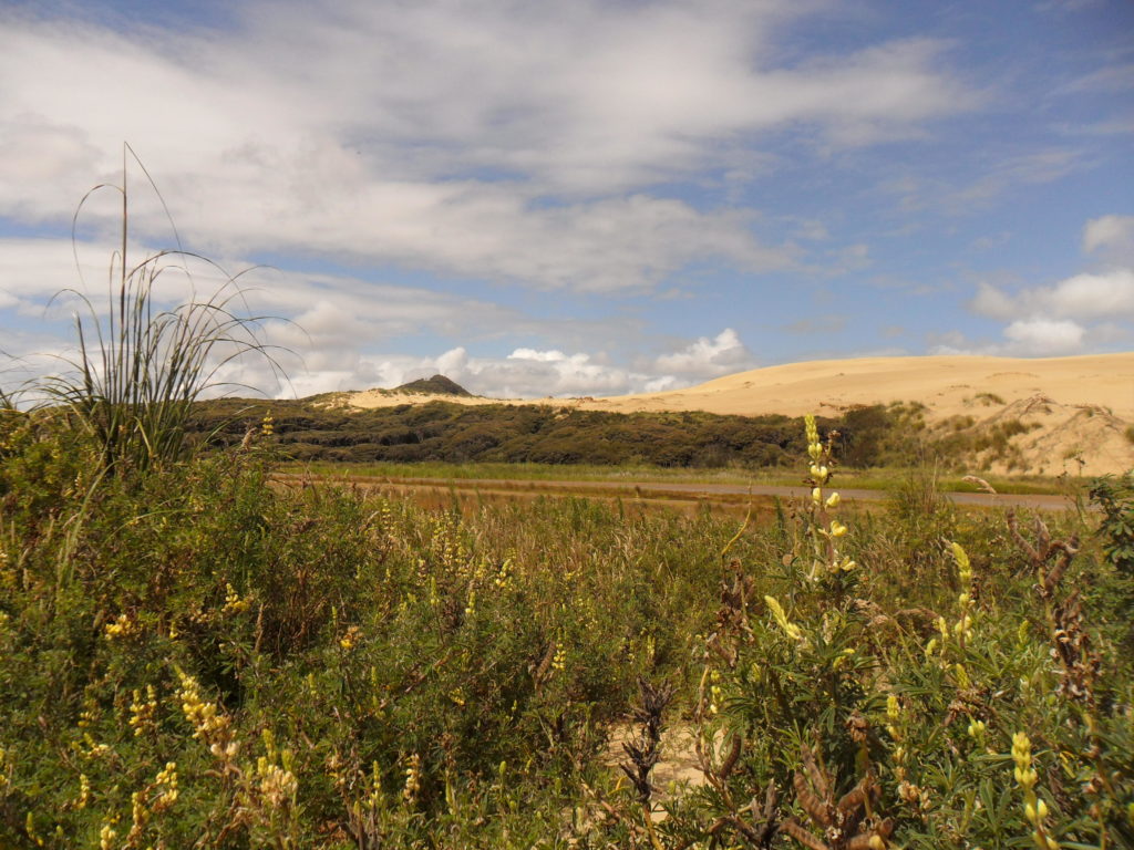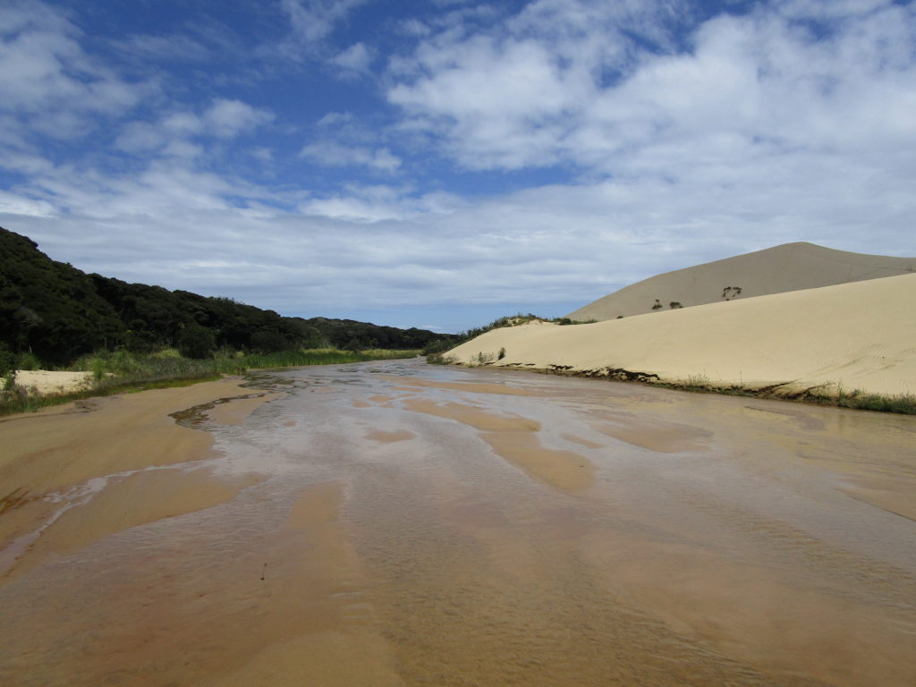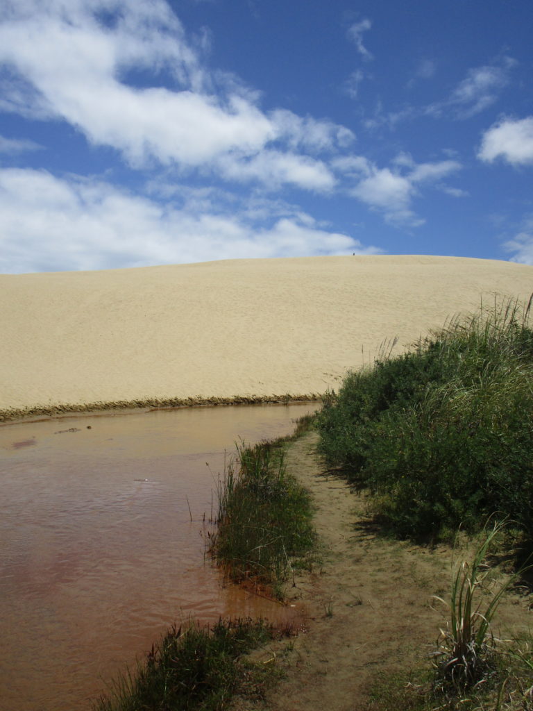 Man sollte ferner nicht ohne Kopfbedeckung über eine Stunde lang durch die besagte Wüstenlandschaft bummeln. Hab ich auch gelernt 😉. Die schützenden Sonnenhüte, welche wir vor zwei Tagen in Auckland ungekauft ließen, vermissen wir spätestens auf dem Rückweg. Wo müssen wir gleich nochmal hin? Die Konzentration leidet von Minute zu Minute und irgendwann sind die Wasserflaschen auch leer. Wir verfranzen uns total und bleiben schließlich im grünen Dickicht stecken. Von der Düne oben sah das so harmlos aus… Langer Rede kurzer Sinn: Umständlich kraxeln wir zurück zum Flusslauf, von dem wir gekommen sind, und erreichen ziemlich erschöpft den Parkplatz (wo im Auto glücklicherweise noch frisches Trinkwasser auf uns wartet).