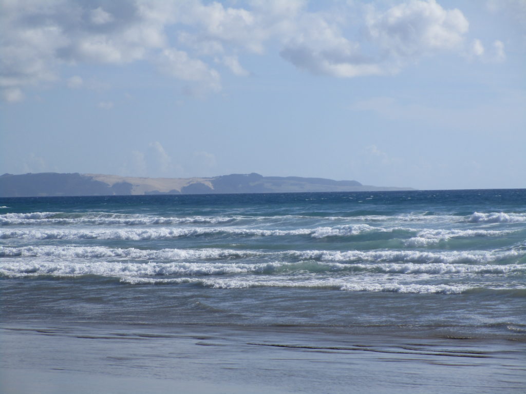 Hach, ausschlafen tut so gut 😊. Nach einem kleinen Frühstück checken wir gegen halb neun aus dem Hotel aus und nehmen unseren Mietwagen in Empfang. Während der Reiseplanung habe ich etwas über den spektakulären Ninety Mile Beach gelesen, auf dem es sogar Fahrzeugen gestattet ist zu fahren. Auf Nachfrage lacht der Service-Mitarbeiter jedoch kurz und gibt uns den freundlichen Hinweis, doch bitte nicht mit dem kleinen PKW auf dem Sandboden zu fahren – der Touristen-Tipp galt wohl nur für große Jeeps…