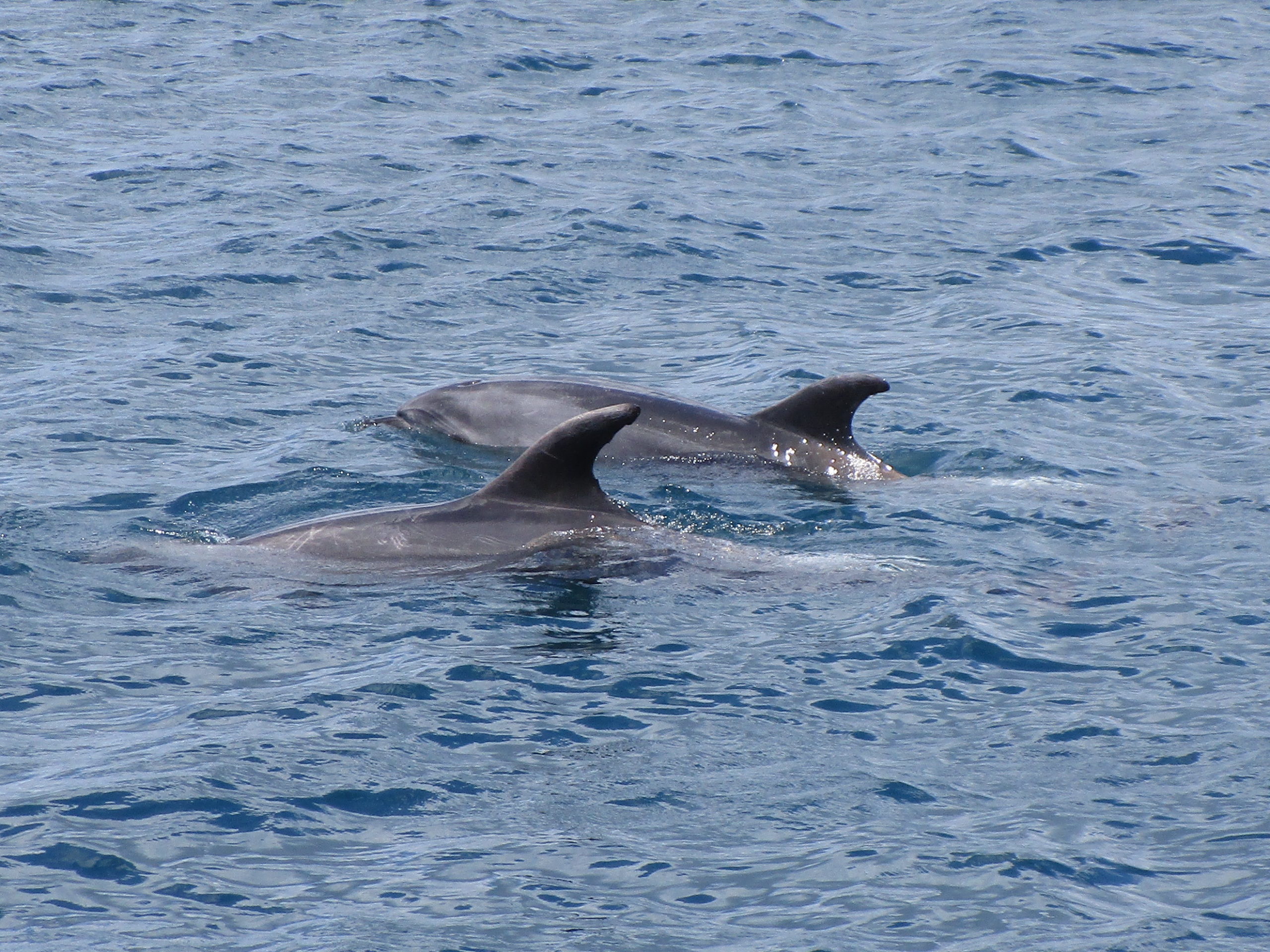 Auf der Weiterfahrt zeigen sich bald die ersten Delfine in der Nähe des Bootes. Der tierische Nachwuchs hat offensichtlich großen Spaß daran, im Wasser zu tollen und mit uns um die Wette zu schwimmen, während die Delfin-Eltern sich gemächlich zurückhalten.