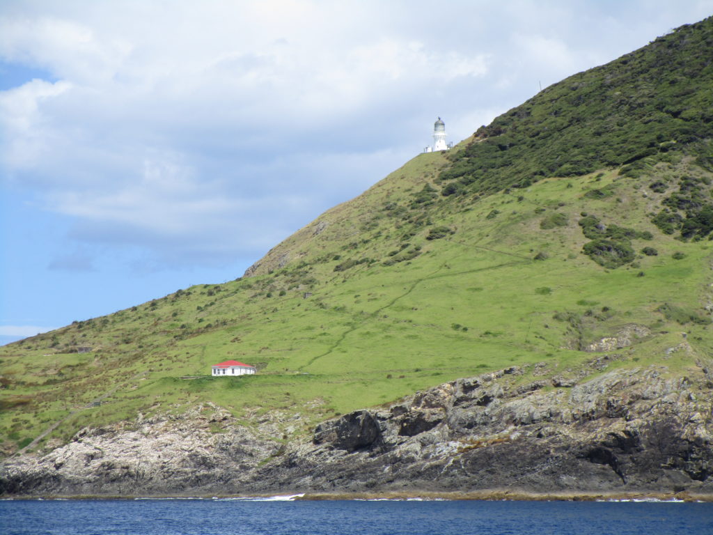Nachdem wir unverletzt und ohne Schrammen auf der anderen Seite des Hole in the Rock heraus kommen, erwarten uns bereits weitere Delfine. In der Ferne erspähen wir einen historischen Leuchtturm bei Cape Brett.