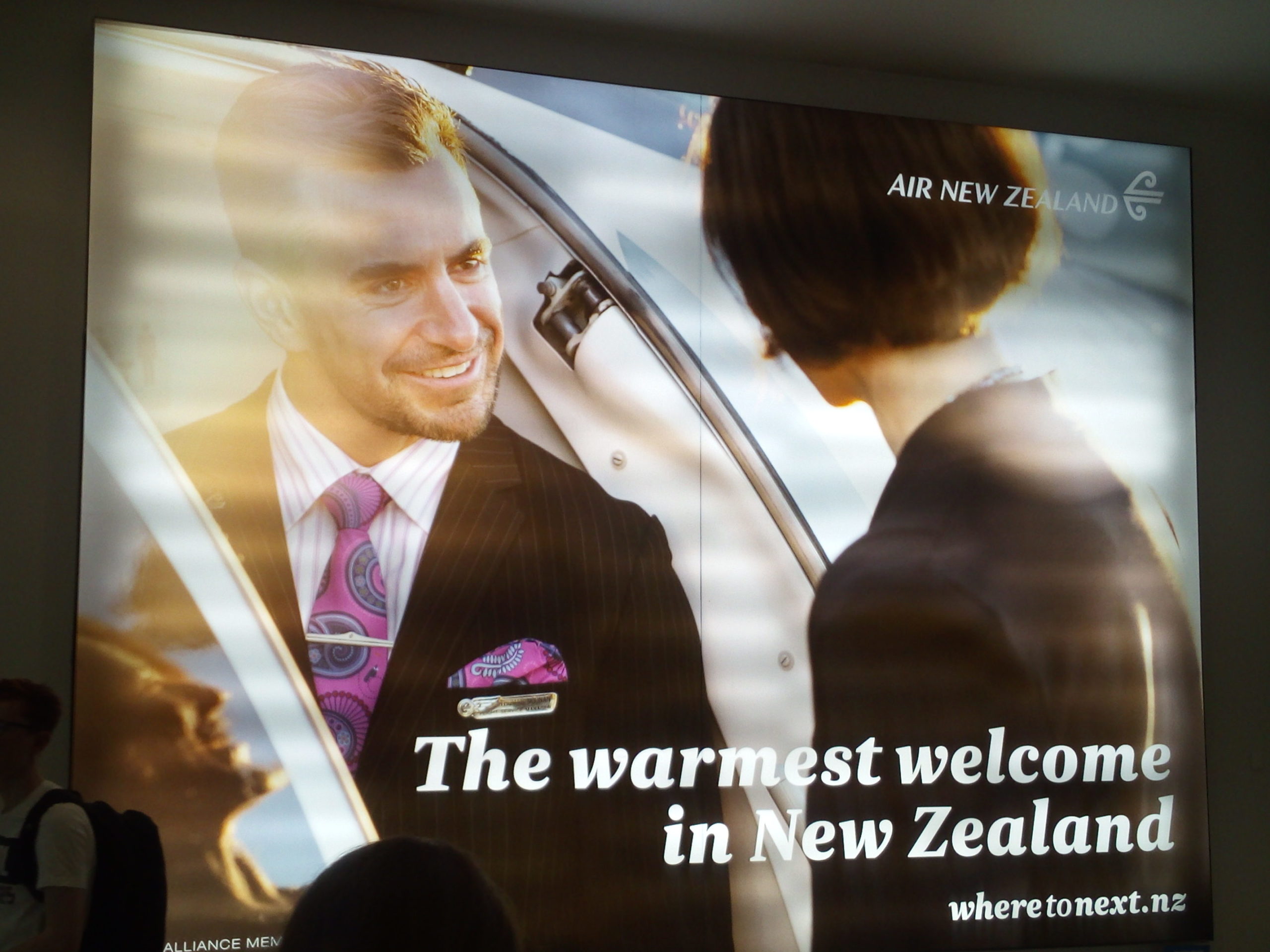 Im strahlenden Sonnenschein landen wir gegen 07:00 Uhr lokaler Zeit am Auckland Airport und stehen zunächst eine Weile auf einem Taxiway herum, bis wir schließlich unsere Parkposition zugewiesen bekommen. Das Flughafen-Terminal empfängt seine internationalen Gäste mit einem großen Schild mit den Worten „The warmest welcome in New Zealand“ 😊.