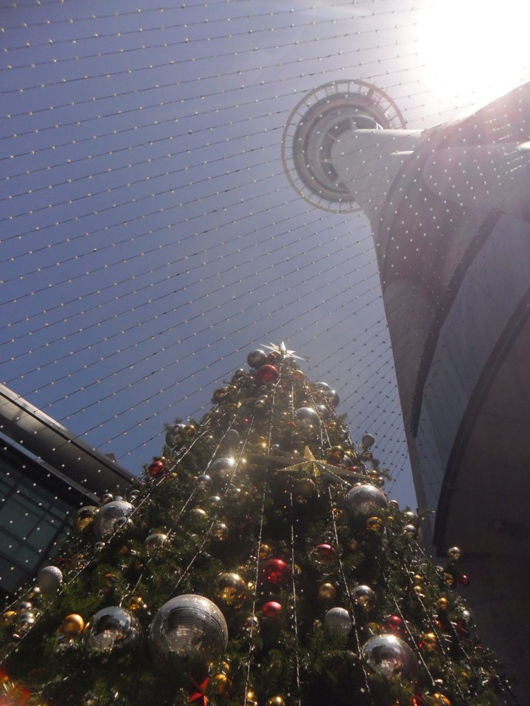 Nachdem uns der Aufzug wieder ins Erdgeschoss gebracht hat, bestellen wir im Café des Sky Towers jeder ein Sandwich und eine heiße Schokolade (vielleicht nicht ganz passend zum Wetter, wohl aber zur Weihnachtsstimmung, welche auch in Auckland mit Kunstschnee und geschmückten Bäumen verbreitet wird). Mithilfe eines Stadtplans überlegen wir uns eine nachmittagsfüllende Route, die uns am schicken Uni-Campus entlangführt, durch einen angenehm kühlen Park und schließlich zum War Memorial Museum.