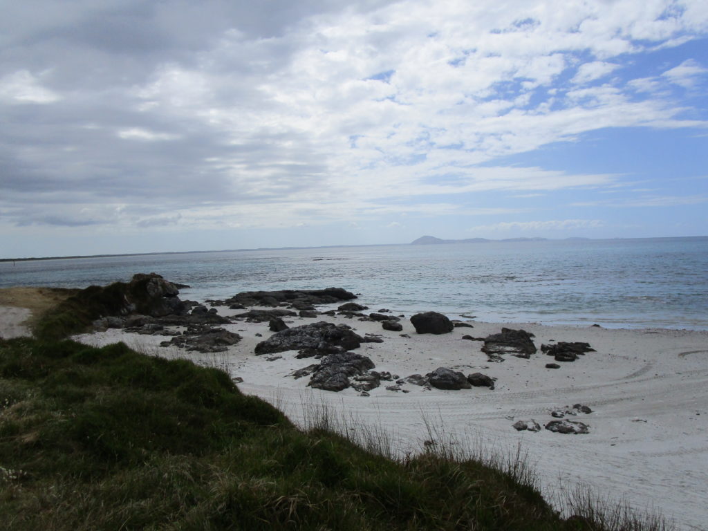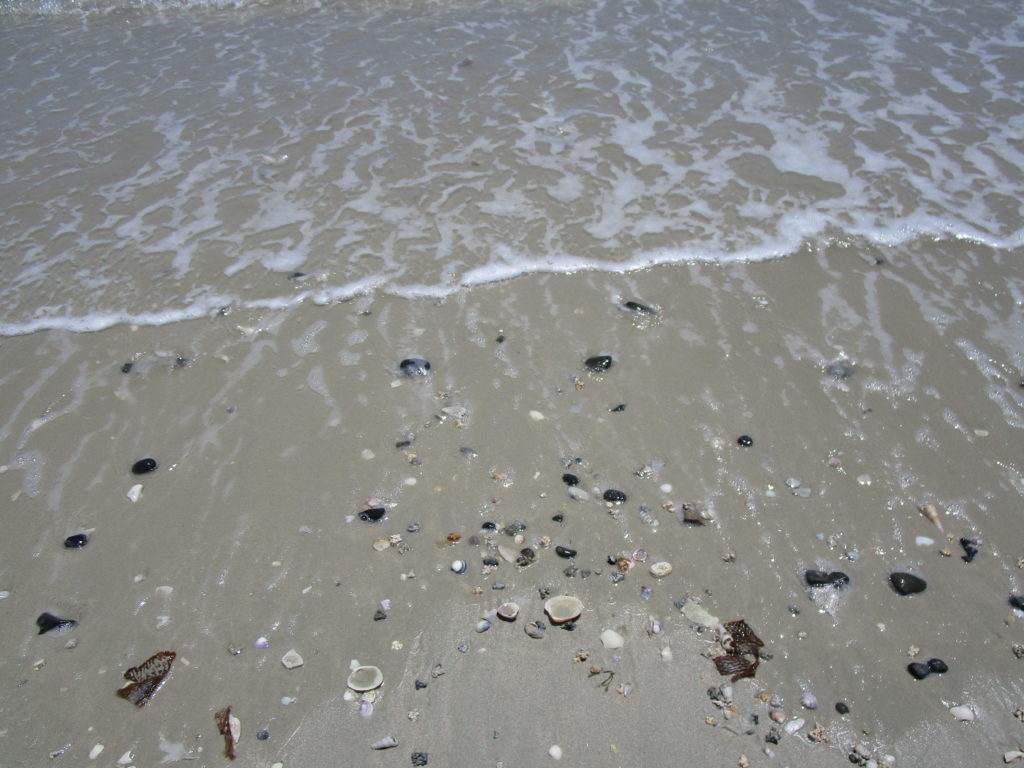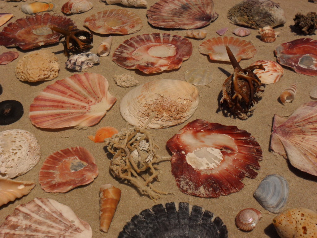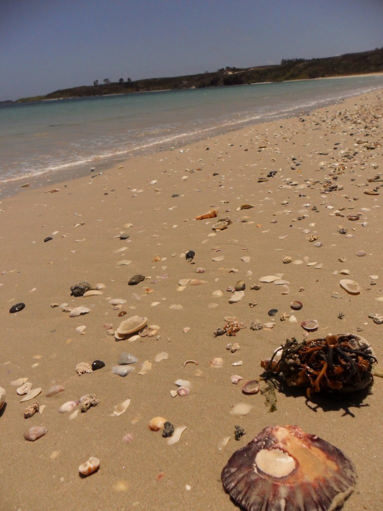 Nach einigen hundert Metern Fußweg entdecken wir kleine grünliche Splitter mit weißen Punkten. So dekorativ und gleichartig, wie sie aussehen, kommt mir der Gedanke, es handle sich um industriell gefertigte Muscheln, die jemand sorgfältig kleingestampft hat. Was natürlich unsinnig anmutet, denn warum sollte das jemand getan haben…