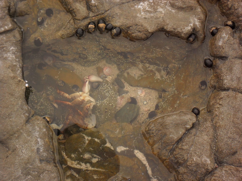 Als ich aus Spaß mit den Füßen über die kleinen Steinfelsen tapse, spüre ich plötzlich ein Klackern und Zwicken. Erschrocken springe ich zurück: Ein paar mittelgroße Krabben haben im kühlen, feuchten Schatten der Felsklüfte genistet und ziehen dort ihren Nachwuchs groß.