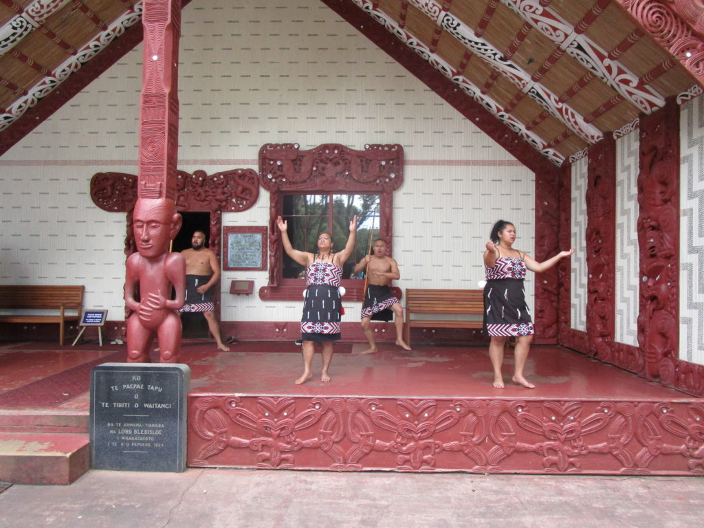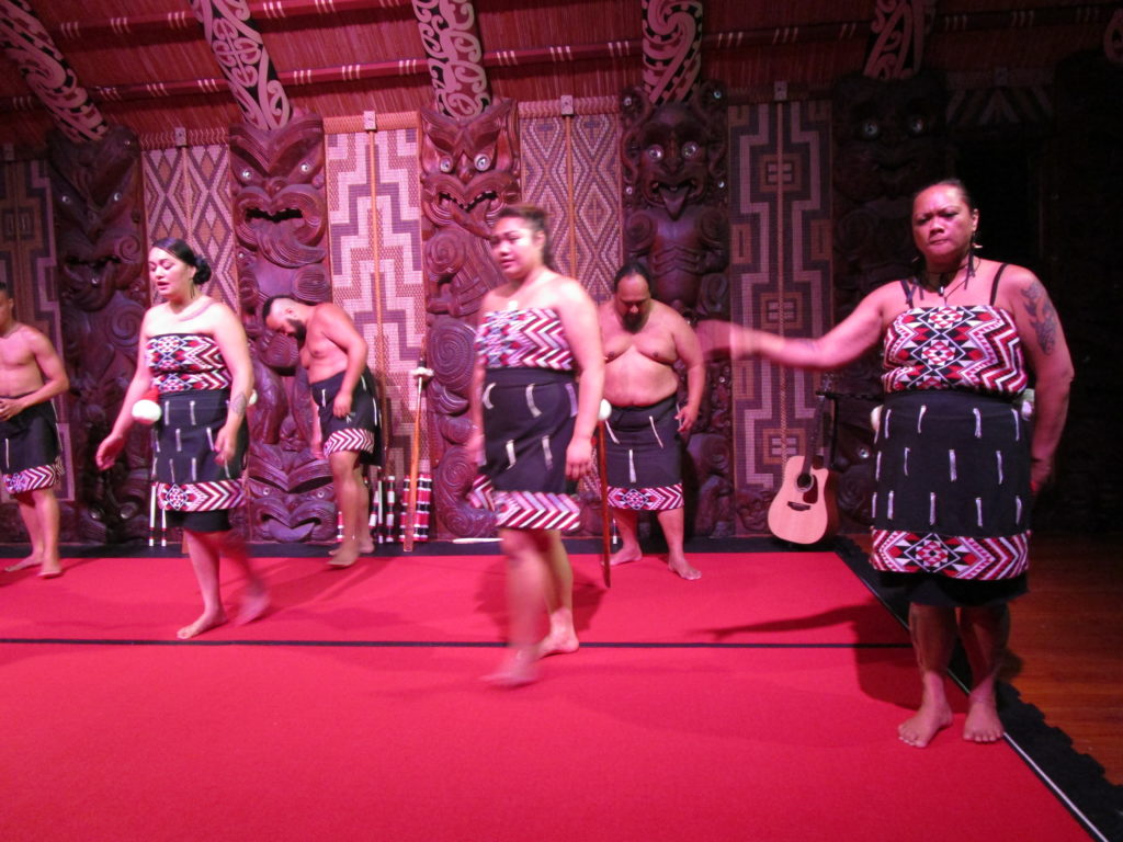 Nach dieser eindrucksvollen Wissensvermittlung dürfen wir die Eindrücke erst einmal sacken lassen. Eine Gruppe von Māori-Schauspielern führt eine Show für die Touristen auf, bei der sowohl traditionelle Māori-Kriegstänze als auch westliche Popmusik der Gegenwart präsentiert werden. So wird halsbrecherisch mit verzierten Holzstöcken gefuchtelt, die den Gesichtern der Zuschauer bedenklich nahe kommen 😱.
