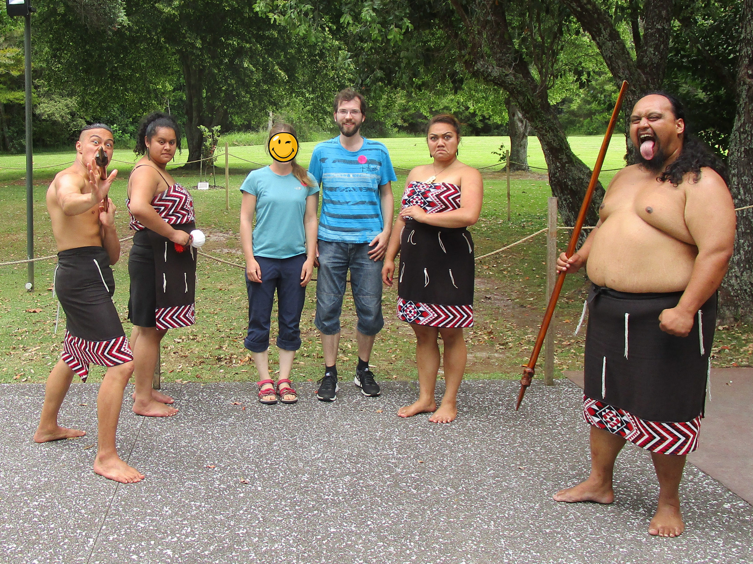 Besonders freue ich mich, als die kunstvoll bemalten Krieger ihre Zungen weit herausstrecken – eine Geste, welche zur Vertreibung von Dämonen praktiziert wurde und den Schauspielern einen äußerst wilden Ausdruck verleiht. Im Anschluss an das Programm dürfen alle Teilnehmenden noch ein Erinnerungsfoto mit den Māori schießen.
